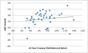 The next two charts are what the president, congress, and the Federal Reserve would learn something from if they opened their minds and dropped the mud for a while.[2] Thirty years ago interest rates were more than double what they are today and growth averaged 5% over four years of the recovery.  We haven’t had 5% growth since 1999 and that lasted one year.  The deficit, however, in the past three years is three to four times the average over the previous 37 years when it held pretty much flat.  It hasn’t mattered but it does now.